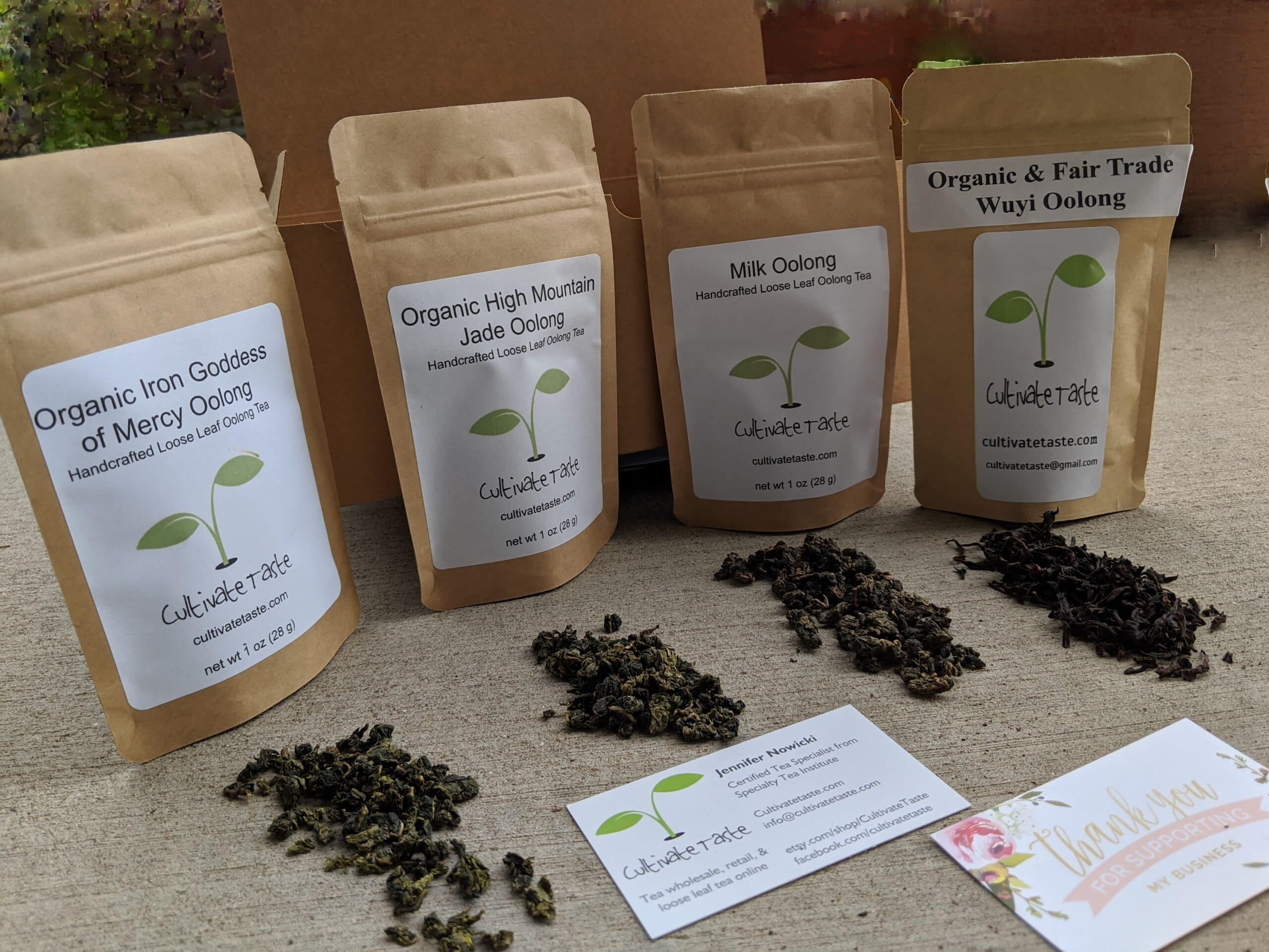 Four 1 oz. bags of loose leaf teas in this set: Iron Goddess of Mercy, High Mountain Jade Oolong, Milk Oolong, and Wuyi Oolong