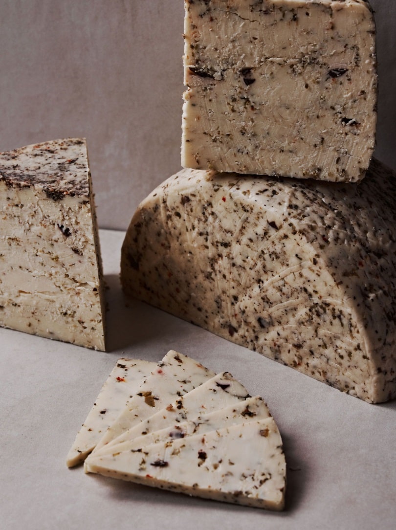 Cypress is a Mediterranean-inspired cheese flavored with a variety of olives, Calabrian chilis, basil, tomato, and dill. This pasteurized cheese has a semi-firm texture and herbaceous finish.