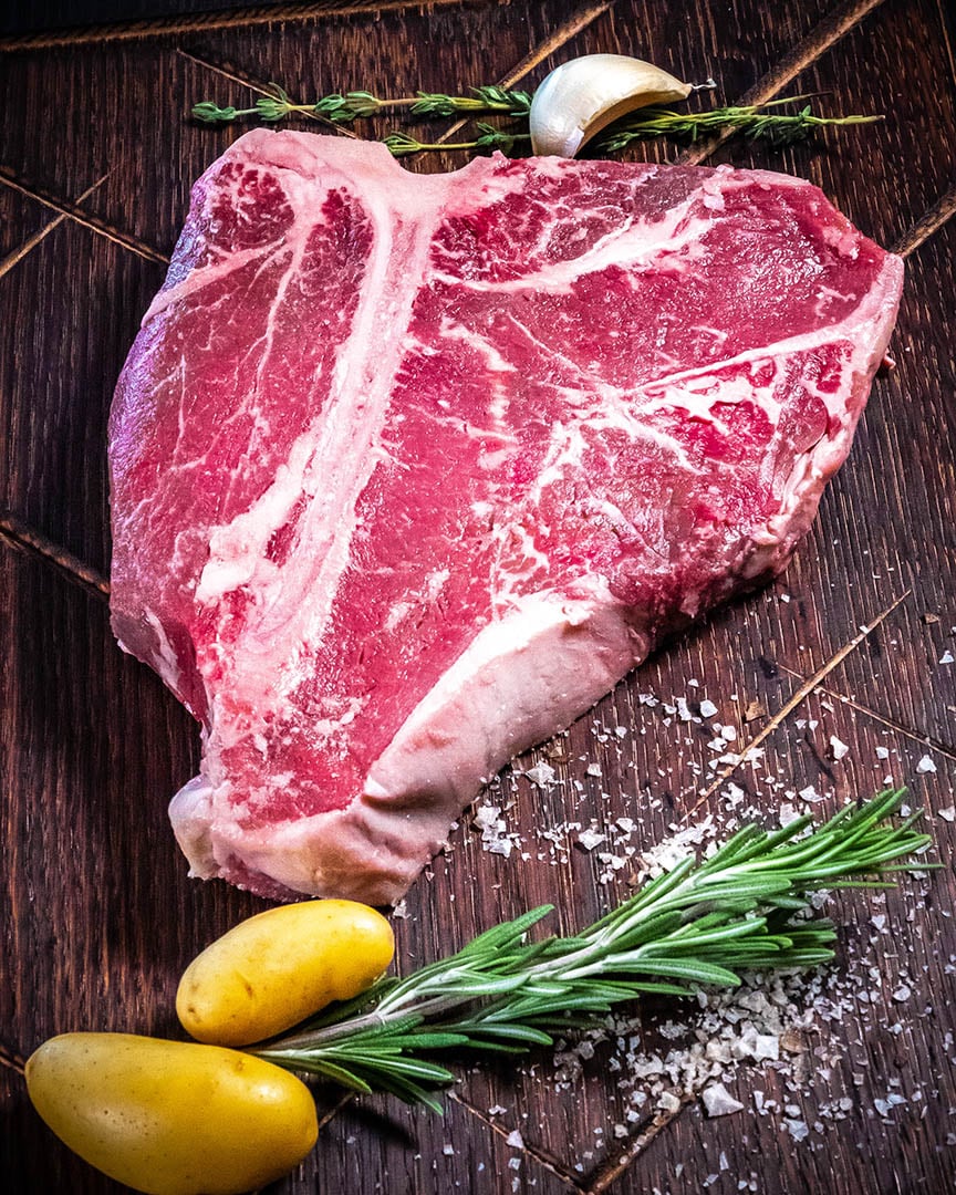 This well-marbled classic steakhouse cut consists of two tender steaks – the strip and tenderloin – connected by a T-shaped bone. In a Porterhouse, the tenderloin is 1-1/4 inch or larger in diameter.