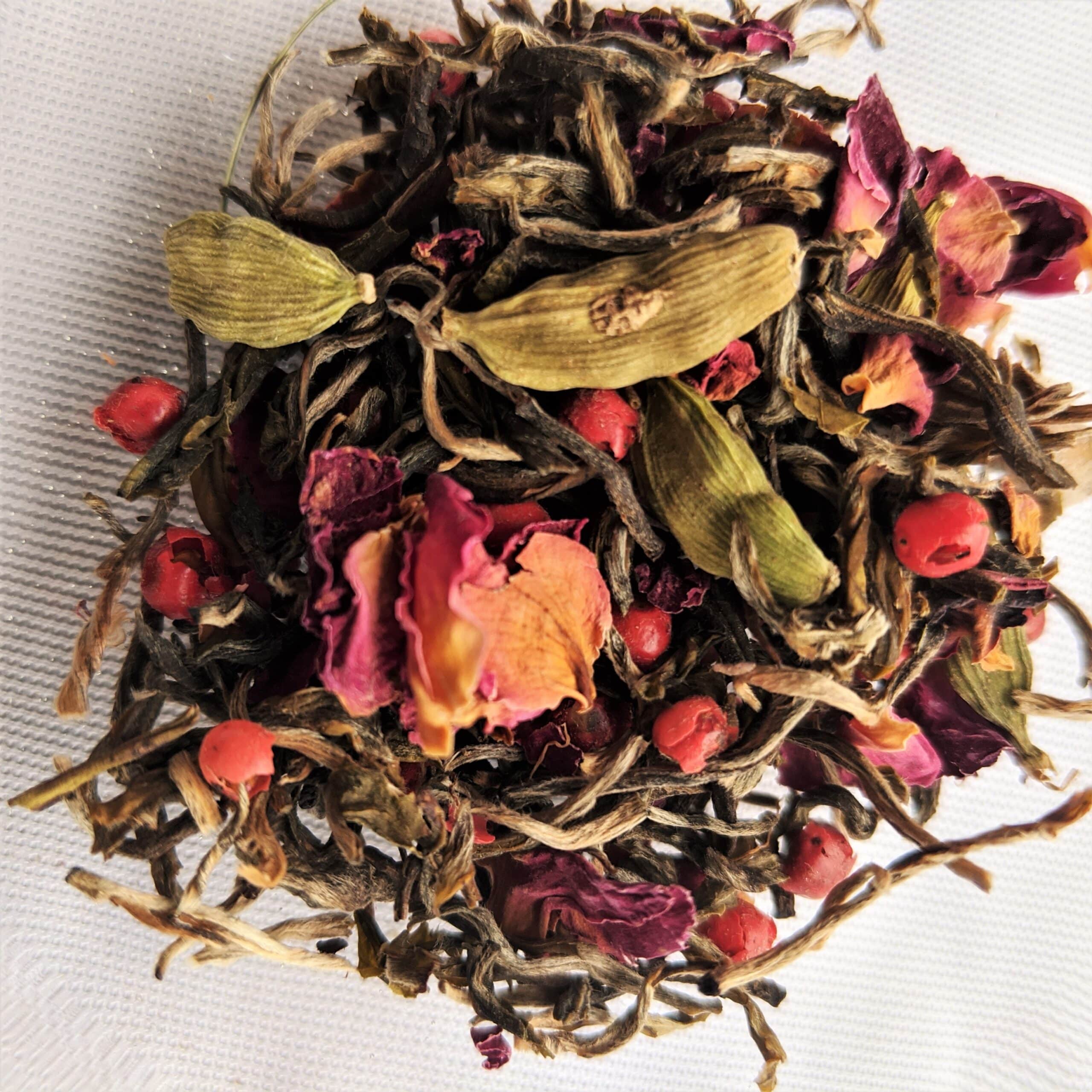 Add some spicy, floral heat to your relationship with this tea. Romance is waiting for you! I wanted to do another white tea blend and wanted something romantic, so I came up with this wonderful blend. Rose petals add a delicate romantic floral element with a little spice from cardamom and light heat and fruitiness from pink peppercorns. The white tea adds a nice base for this delicate tea.