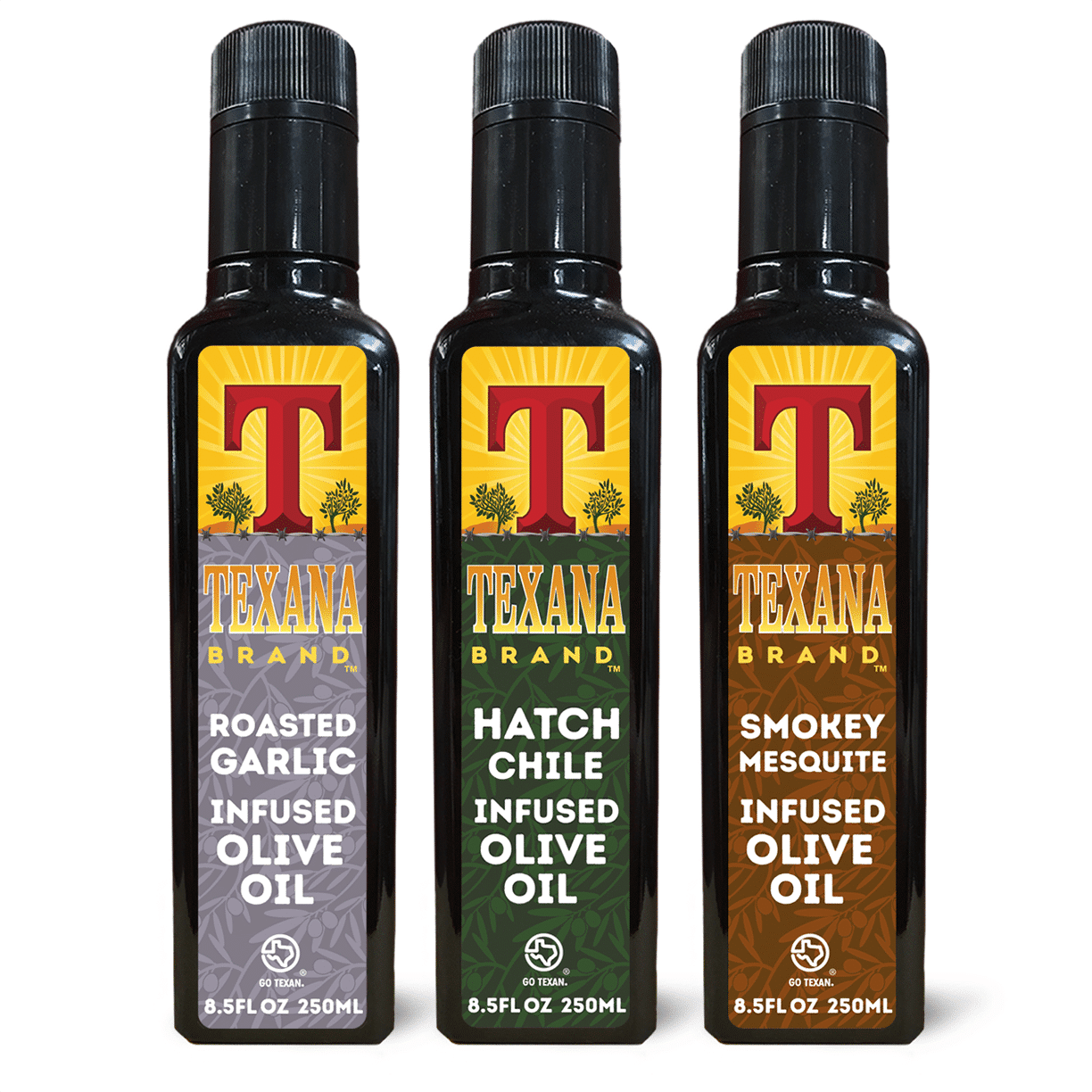 The perfect set of infused olive oils for the BBQ lover in your life! This set features three 8.5oz bottles of Texana’s flavorful small-batch extra virgin olive oils – Roasted Garlic, Hatch Chili, and Smokey Mesquite. All of Texana’s oils are all-natural, 100% made in the U.S.A, Texas home grown, infused with all natural oils, unfiltered, non-GMO, gluten Free, cold Pressed Arbequina olives. Each is perfect for salad dressings, roasting, grilling, BBQing, marinades, and more.